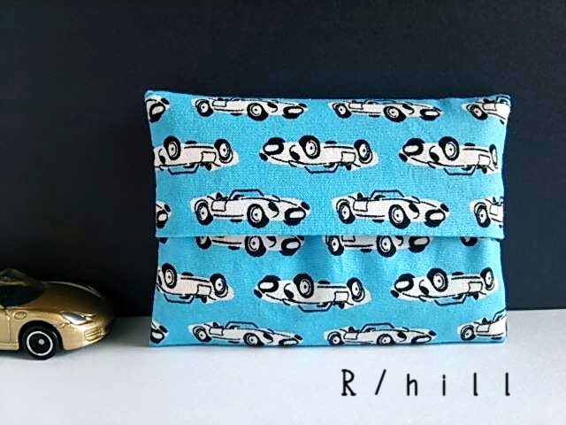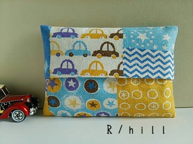 ミニポケットティッシュケース*リバーシブル*車パッチ柄×青りんご