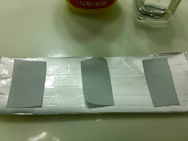 土台として、内側にアルミコーティングされた豆乳パックを適当なサイズに切って、セロハンテープを貼ってみたもの