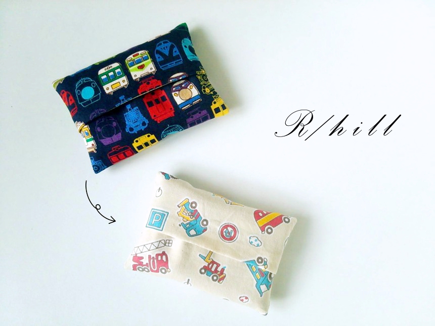 リバーシブル*ミニポケットティッシュケース*トレインフェイス柄×働く車柄