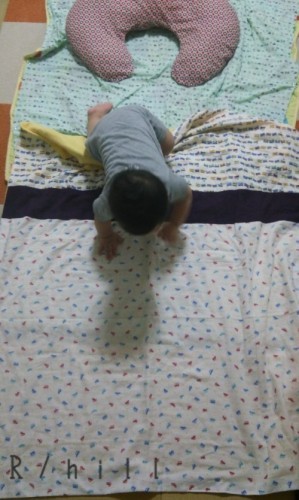 ちなみに、ガーゼケットの上に映り込んでいる緑のものは次男用に作った部屋用のマットで、授乳クッションも自作のものです。